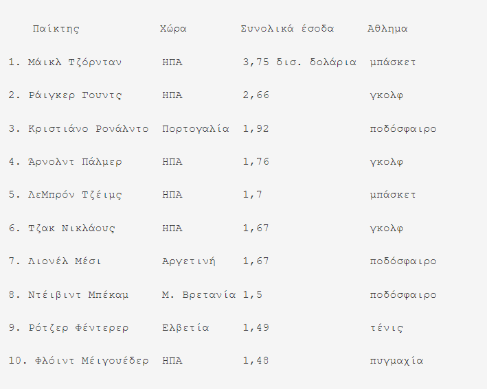 Μία κατάταξη, που παρουσίασε η εξειδικευμένη ιστοσελίδα «sportico»-και αναδημοσίευσε η ισπανική εφημερίδα «marca»- και στην κορυφή της βρίσκεται ο θρύλος του ΝΒΑ Μάικλ Τζόρνταν με 3,75 δισεκατομμύρια δολάρια, μπροστά από τον πρωταθλητή του γκολ Ταίγκερ Γουντς (2,66 δισ. δολάρια), ενώ το βάθρο συμπληρώνει ο Πορτογάλος σούπερ σταρ του ποδοσφαίρου Κριστιάνο Ρονάλντο (1,92 δισ. δολάρια).