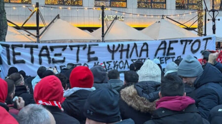 ΕΙΚΟΝΕΣ: Φίλοι του Ολυμπιακού ύψωσαν πανό στο Άμστερνταμ για τους αδικοχαμένους οπαδούς του ΠΑΟΚ