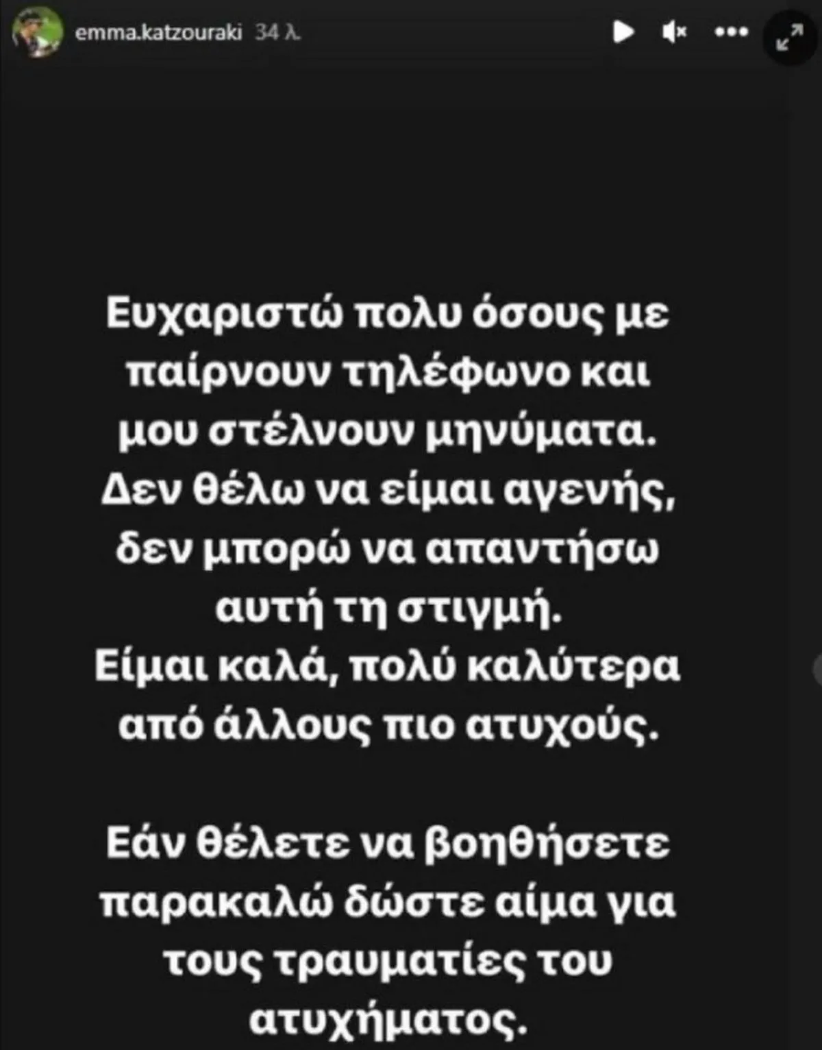 Η πρωταθλήτρια, μετά το έγκλημα στα Τέμπη, σε σχετική ανάρτηση που είχε κάνει, είχε ευχαριστήσει για τα τηλέφωνα και τα μηνύματα που δέχεται, εξηγώντας πως “δεν θέλω να είμαι αγενής, δεν μπορώ να απαντήσω αυτή τη στιγμή. Είμαι καλά, πολύ καλύτερα από άλλους πιο άτυχους“.