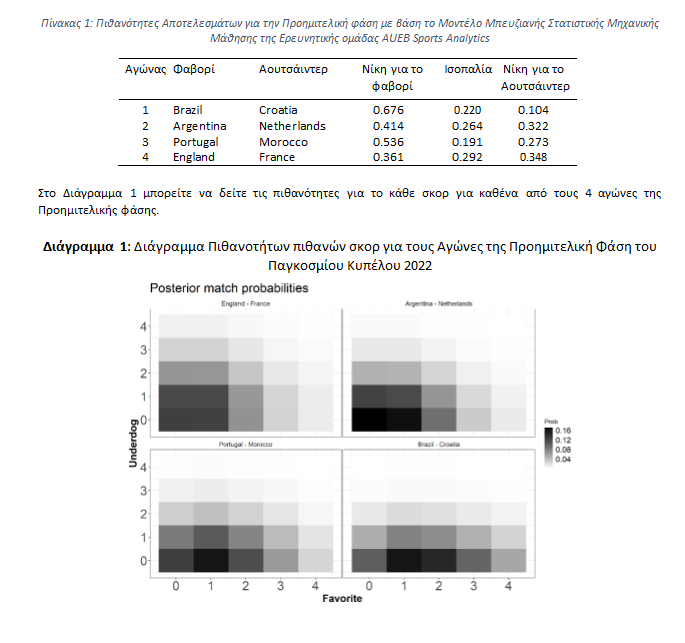 Οι Προβλέψεις του Μοντέλου για την Φάση των Προημιτελικών Οι ενημερωμένες προβλέψεις με τη μορφή πιθανοτήτων δίνονται στον Πίνακα 1. Ως φαβορί δηλώνεται η ομάδα με τη μεγαλύτερη πιθανότητα νίκης.