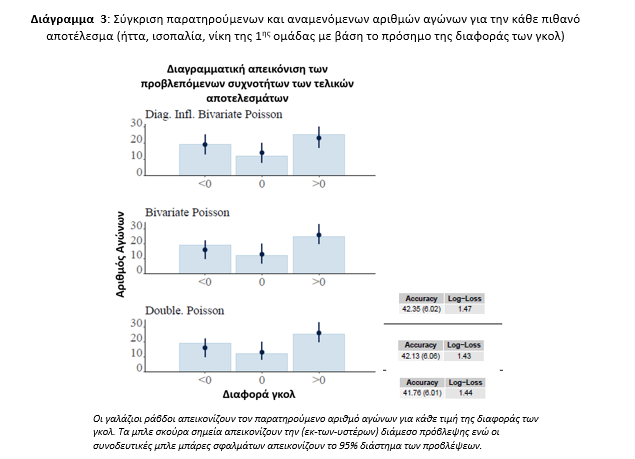 Με βάση το Διάγραμμα 2, παρατηρούμε ότι όλα τα προσαρμοσμένα μοντέλα παρουσιάζουν παρόμοιες επιδόσεις τόσο όσον αφορά τη γραφική αναπαράσταση όσο και τη τιμή σφάλματος του MAE. Η ομοιότητα μεταξύ των προβλεπτικών επιδόσεων όλων των μοντέλων είναι προφανής από τα αντίστοιχα διαγράμματα, όπου σε όλα αυτά, οι διάμεσοι των προβλέψεων (σκούρα σημεία) είναι κοντά στις παρατηρούμενες συχνότητες. Μια προφανής διαφορά μεταξύ των διαφορετικών προσεγγίσεων είναι ότι το Μοντέλο 1 προβλέπει με αυξημένη πιθανότητα την ισοπαλία (δλδ τη διαφορά τερμάτων ίση με μηδέν) σε σύγκριση με τα Μοντέλα 2 και 3.