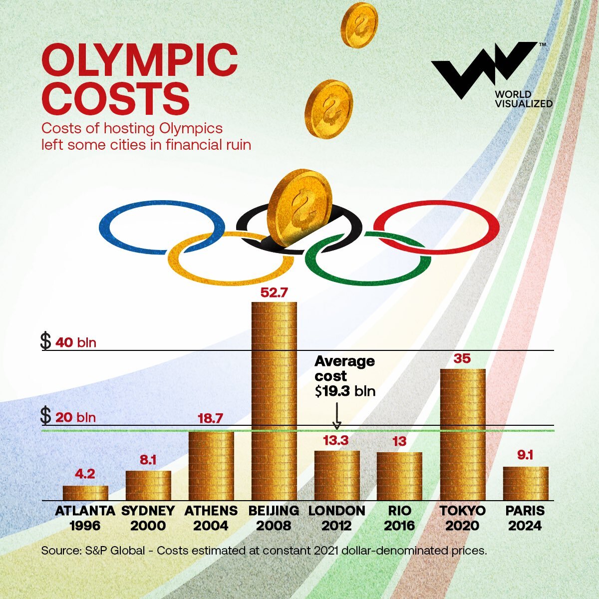 Σε γράφημα των World Visualized βασισμένο στα ευρήματα του S&P Global, βλέπουμε πως οι πιο κοστοβόροι Ολυμπιακοί Αγώνες φαίνεται να είναι αυτοί του Πεκίνου. Το συνολικό κόστος των Ολυμπιακών Αγώνων του 2008 ανέρχεται σε 52.7 δισ. δολάρια, ποσό που έχει θέσει πολύ υψηλά τον πήχη της διοργάνωσης.