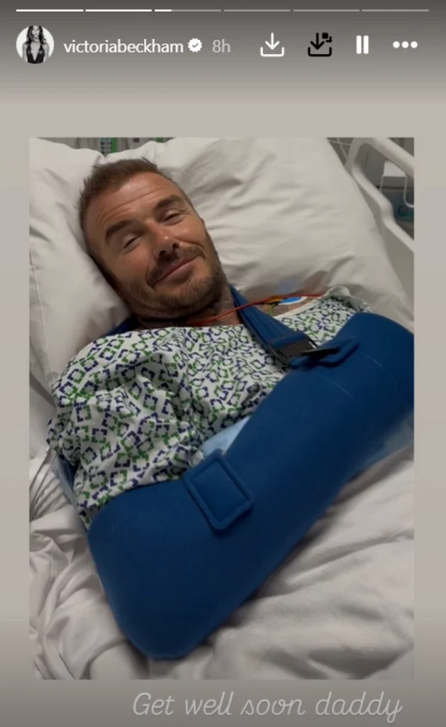 Ο πρώην ποδοσφαιριστής και συνιδιοκτήτης της Inter Miami CF αναρρώνει έπειτα από μία επέμβαση στην οποία υποβλήθηκε και στη φωτογραφία που μοιράστηκε η σχεδιάστρια μόδας και πρώην Spice Girl στο Instagram, ο ίδιος φαίνεται να είναι ξαπλωμένος σε κρεβάτι νοσοκομείου με το χέρι του σε νάρθηκα.