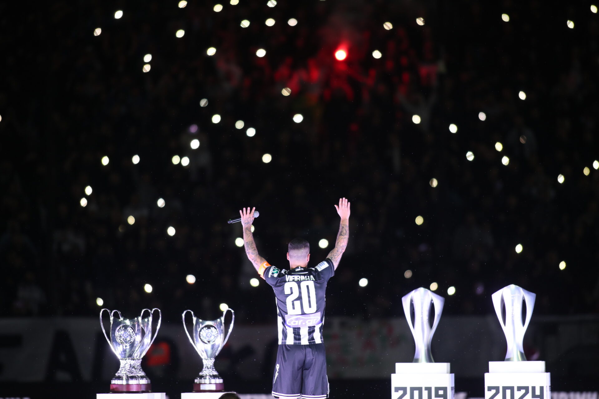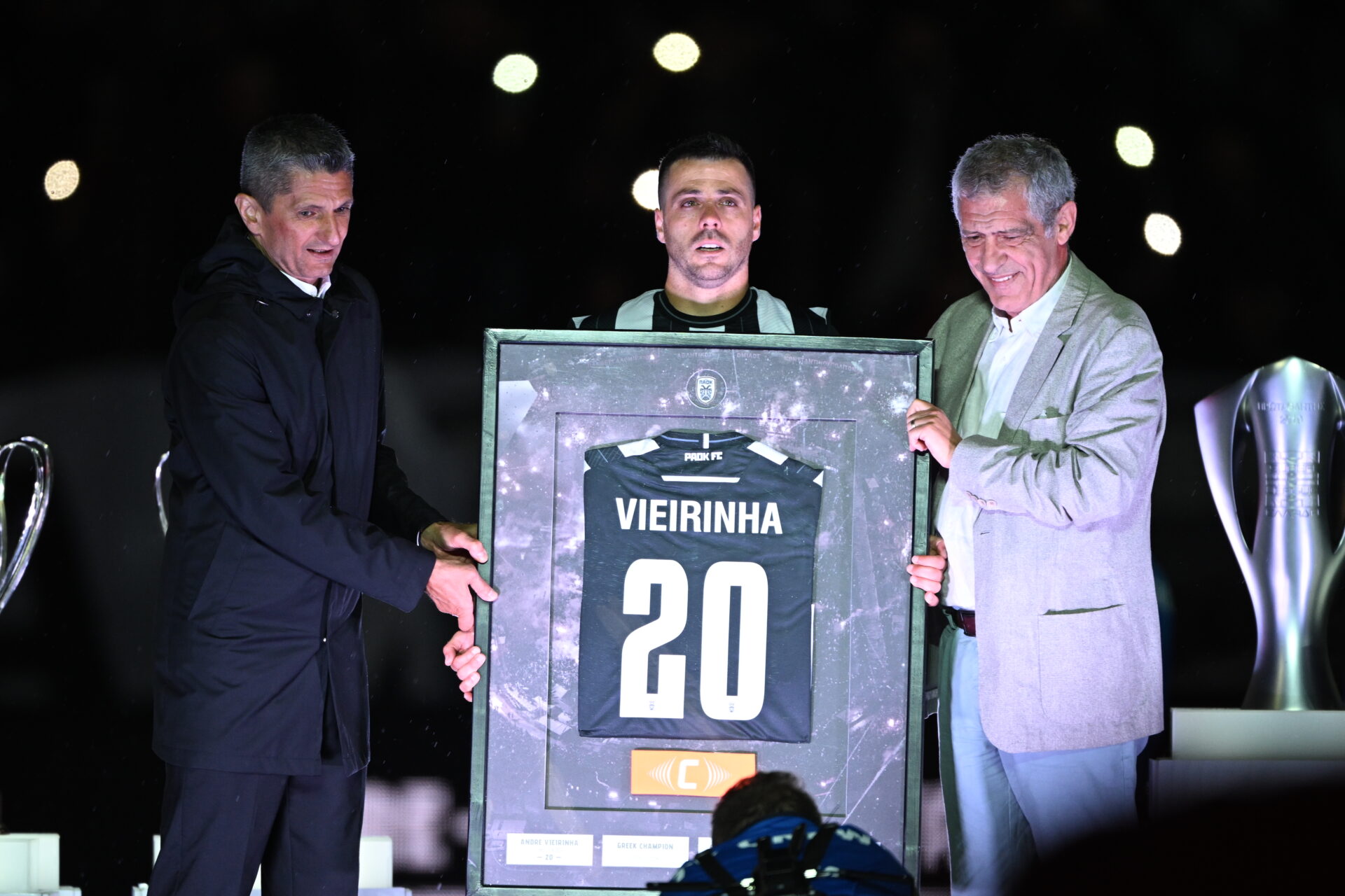 Η βραδιά, όμως, ήταν αφιερωμένη στον θρύλο και μεγάλο αρχηγό του ΠΑΟΚ Αντρέ Βιεϊρίνια ο οποίος είχε ανακοινώσει πως το χθεσινό παιχνίδι θα ήταν το τελευταίο του στην ποδοσφαιρική του καριέρα.