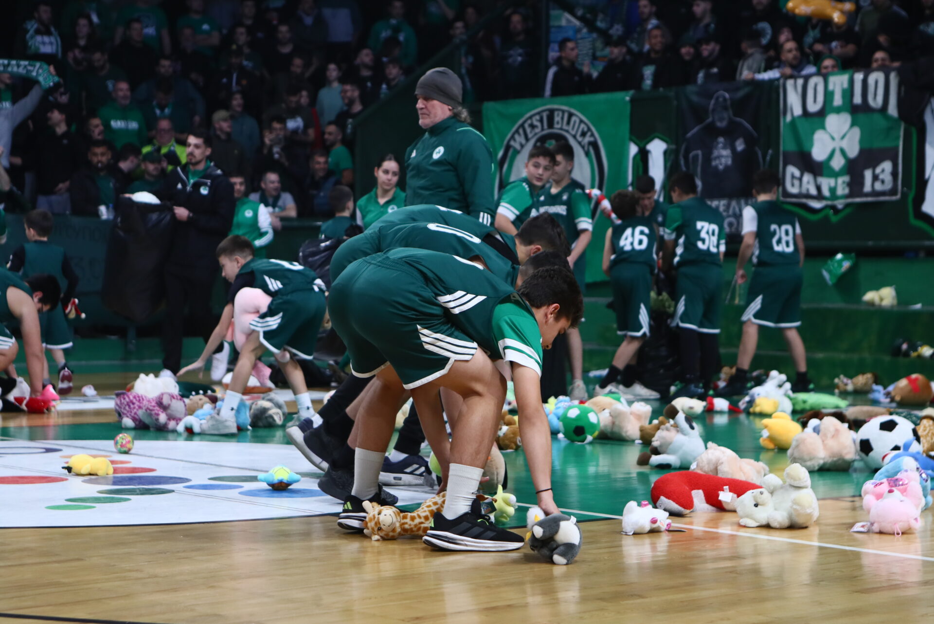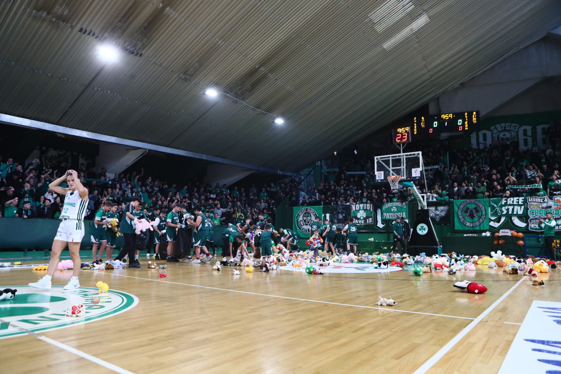 Λίγο πριν ξεκινήσει το παιχνίδι στο «Παύλος Γιαννακόπουλος», το παρκέ γέμισε από εκατοντάδες λούτρινα κουκλάκια που πέταξαν οι οργανωμένοι οπαδοί του «τριφυλλιού» από τις κερκίδες.
