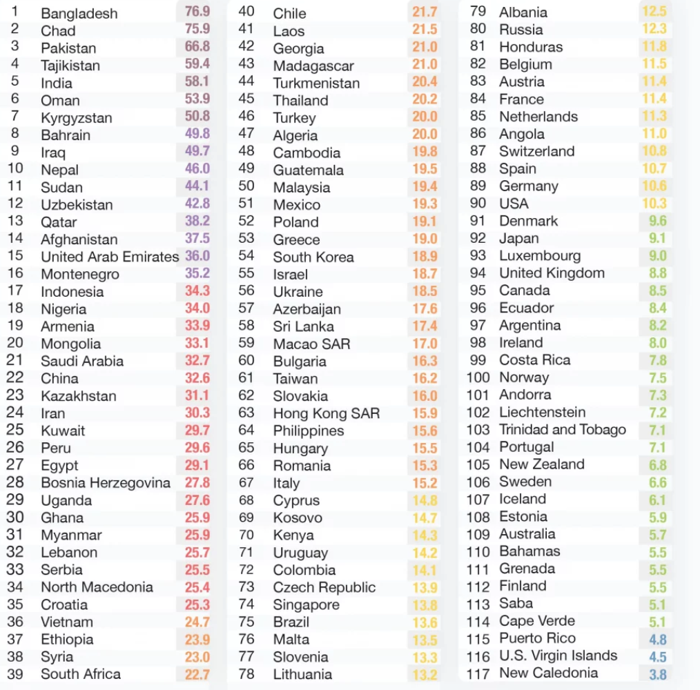 Το Μπανγκλαντές ήταν η πιο μολυσμένη χώρα, επίσης αμετάβλητο από το προηγούμενο έτος, ενώ το Τσαντ κατέλαβε τη δεύτερη θέση αφού συμπεριλήφθηκαν για πρώτη φορά τα στοιχεία της αφρικανικής χώρας.
