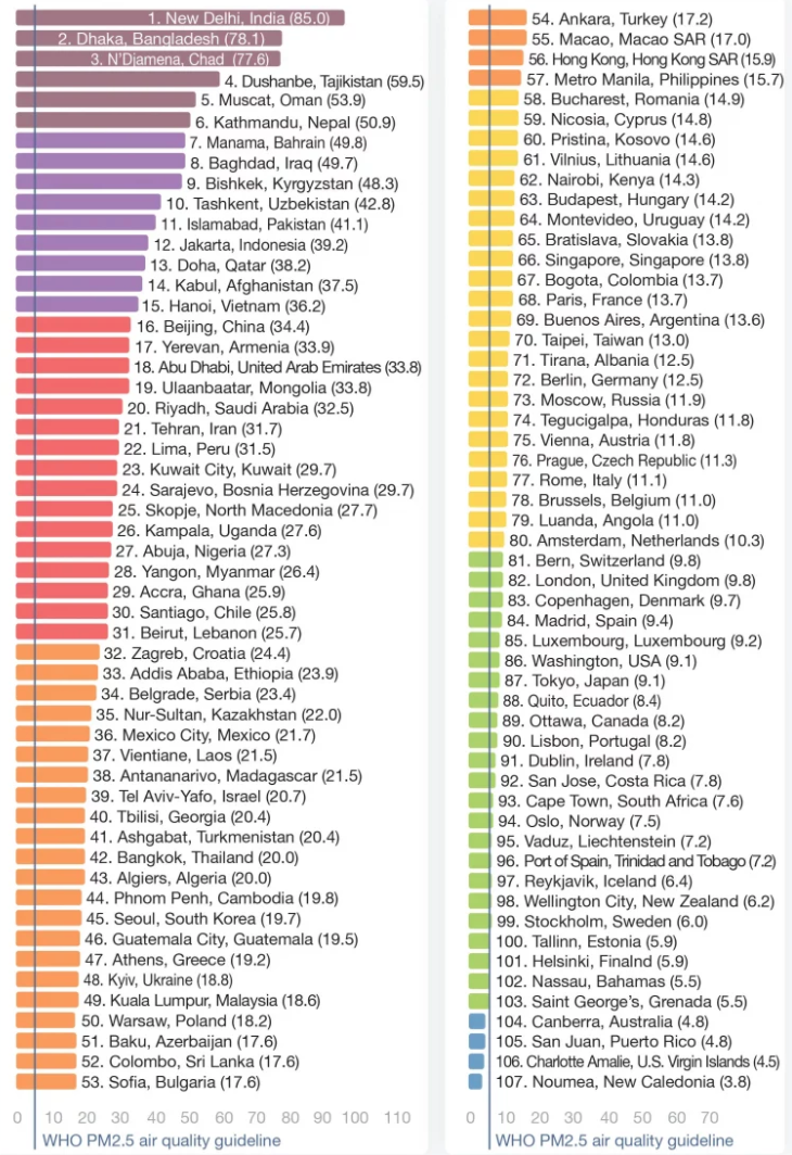 Ωστόσο, μόνο το 3,4% των πόλεων που συμμετείχαν στην έρευνα πληρούσαν τα πρότυπα το 2021, σύμφωνα με στοιχεία που διαμορφώθηκαν από την IQAir, μια ελβετική εταιρεία τεχνολογίας ρύπανσης που παρακολουθεί την ποιότητα του αέρα. Έως και 93 πόλεις είδαν επίπεδα PM2,5 , έως και 10 φορές πάνω το συνιστώμενο επίπεδο.