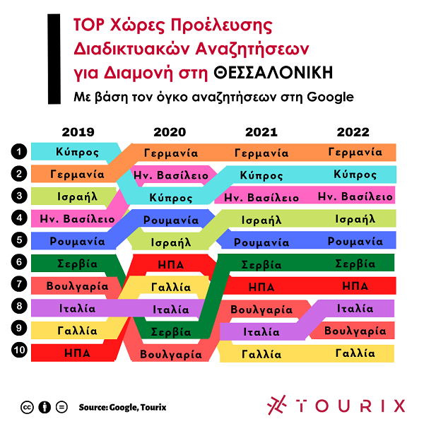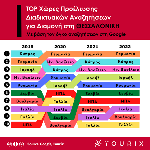 Οι κορυφαίες χώρες σε επίπεδο αναζητήσεων για διαμονή στη Θεσσαλονίκη για το 2022 ήταν Γερμανία και ακολουθούν με σημαντική διαφορά Κύπρος, το Ηνωμένο Βασίλειο, το Ισραήλ και η Ρουμανία. Σημαντικές είναι και οι αγορές-χώρες που συμπληρώνουν τη δεκάδα που είναι η η Σερβία, οι ΗΠΑ, η Ιταλία, η Βουλγαρία και η Γαλλία.