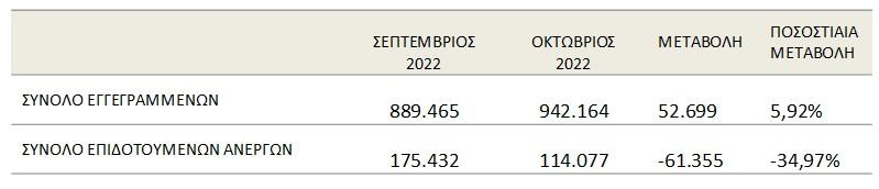 Συγκεκριμένα, ο αριθμός των εγγεγραμμένων ανέργων ανήλθε σε 942.164 άτομα τον Οκτώβριο, σημειώνοντας άνοδο κατά 5,92% σε σχέση με τους 889.465 ανέργους τον περασμένο Σεπτέμβριο.