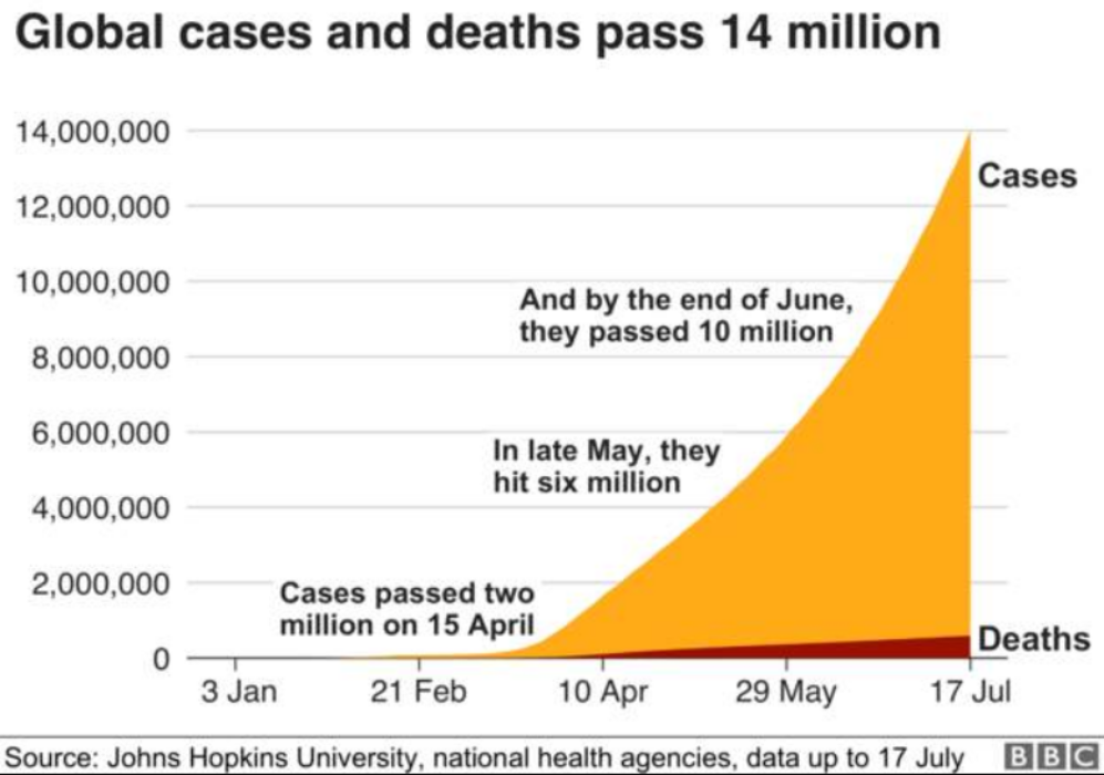 Ο κοροναϊός συνεχίζει να εξαπλώνεται σε όλο τον κόσμο, με παραπάνω από 14 εκατομμύρια επιβεβαιωμένα κρούσματα σε 188 χώρες. Περισσότεροι από 600,00 άνθρωποι έχουν χάσει την ζωή του.