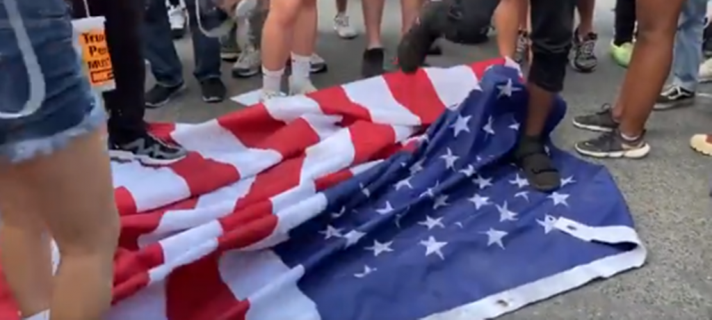 Ένα από τα βίντεο, που γυρίστηκε σε πλατεία έξω από τον Λευκό Οίκο και που ονομάστηκε επίσημα «Black Lives Matter Plaza» μετά τις διαμαρτυρίες, δείχνει μια νεαρή γυναίκα να χορεύει πάνω στην αμερικανική σημαία, ενώ μια άλλη διαδηλώτρια με μεγάφωνο ακούγεται να λέει: «Γ*** την 4η Ιουλίου. Γ*** την αμερικανική σημαία. Αυτό λέμε. ”