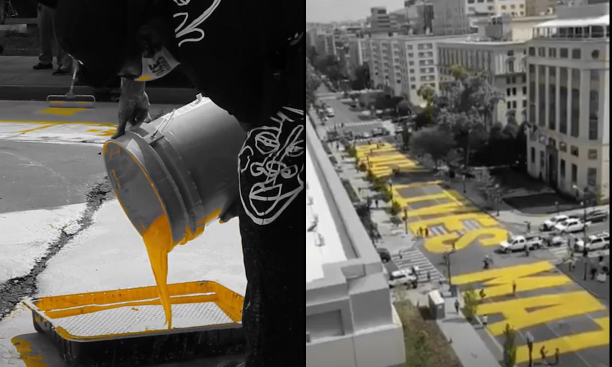 Ένα γιγαντιαίο μήνυμα διαμαρτυρίας τοποθετήθηκε σαν πανό στην άσφαλτο ενός από τους πολυσύχναστους δρόμους της Ουάσινγκτον. Το BLACK LIVES MATTER εκτείνεται σε μήκος δύο τετραγώνων της 16th Street, κεντρικού άξονα που οδηγεί νότια, στον Λευκό Οίκο. Κάθε ένα από τα κεφαλαία κίτρινα γράμματα καλύπτει και τους δύο άξονες του δρόμου, από πεζοδρόμιο σε πεζοδρόμιο.