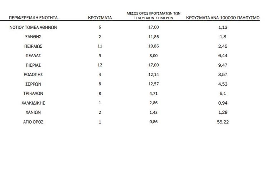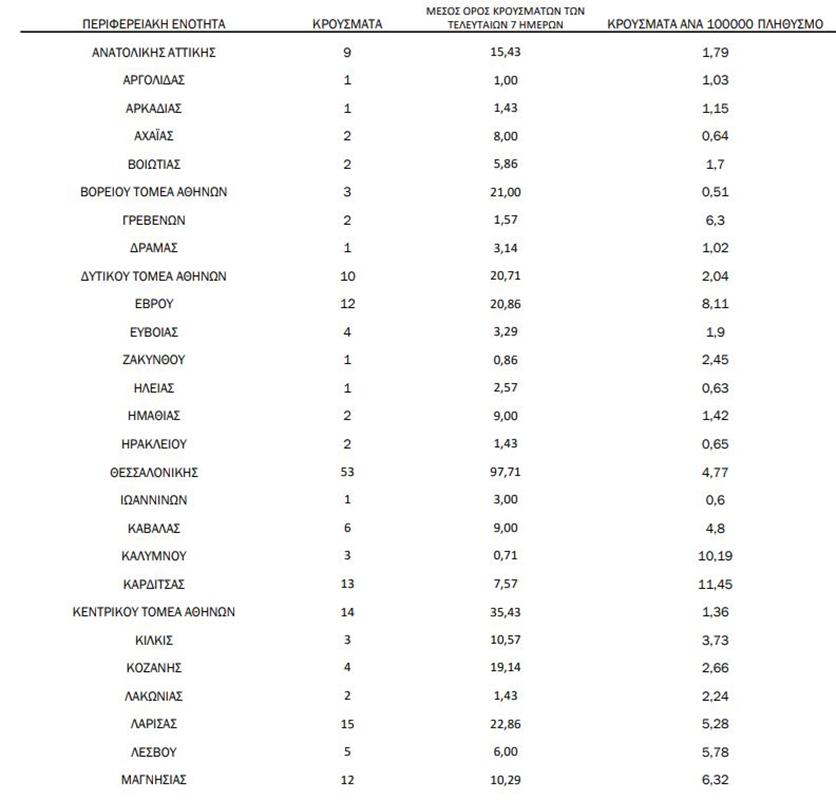 Αναλυτικά η κατανομή των νέων κρουσμάτων στη χώρα μας: