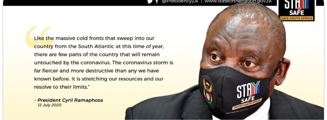 «Καθώς κατευθυνόμαστε προς την κορύφωση των μολύνσεων, είναι ζωτικής σημασίας να μην επιβαρύνουμε τις κλινικές και τα νοσοκομεία μας με περιστατικά ανθρώπων που τραυματίστηκαν έπειτα από κατανάλωση αλκοόλ και τα οποία θα μπορούσαν να έχουν αποφευχθεί», δήλωσε ο πρόεδρος της Νότιας Αφρικής σε τηλεοπτικό διάγγελμά του.