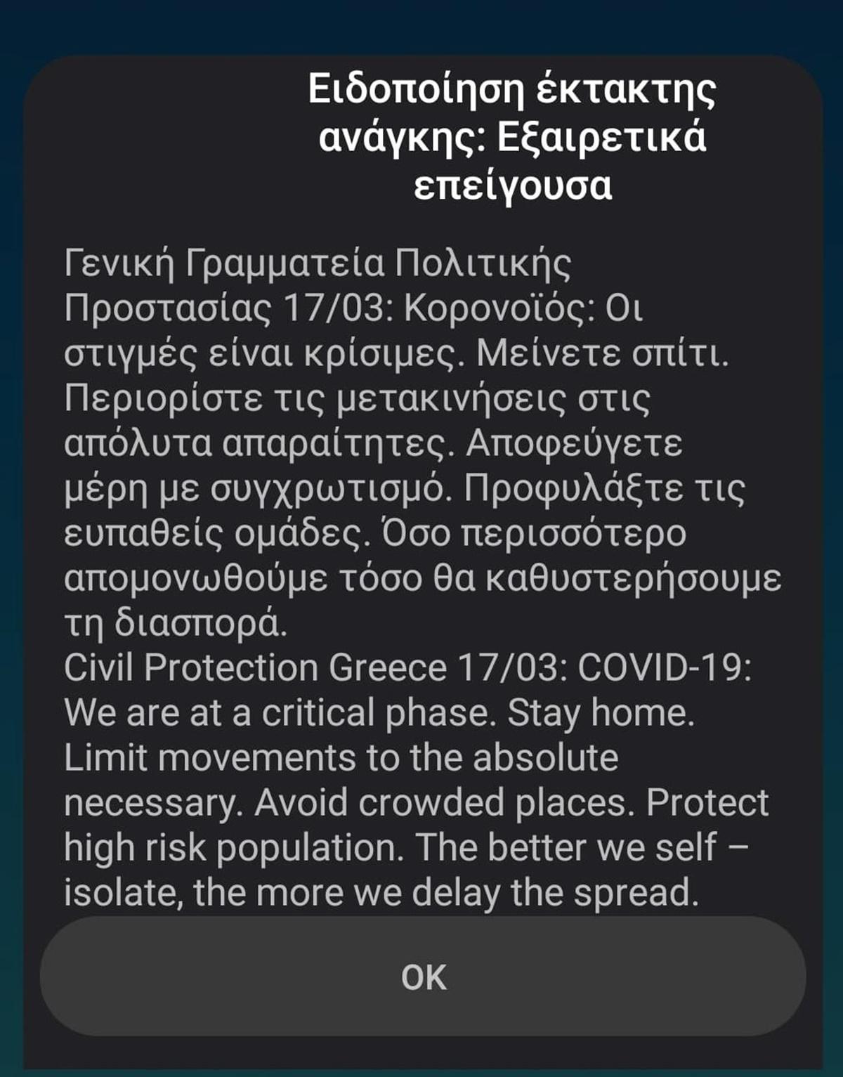 Δεύτερο μήνυμα από την Πολιτική Προστασία για τον κοροναϊό