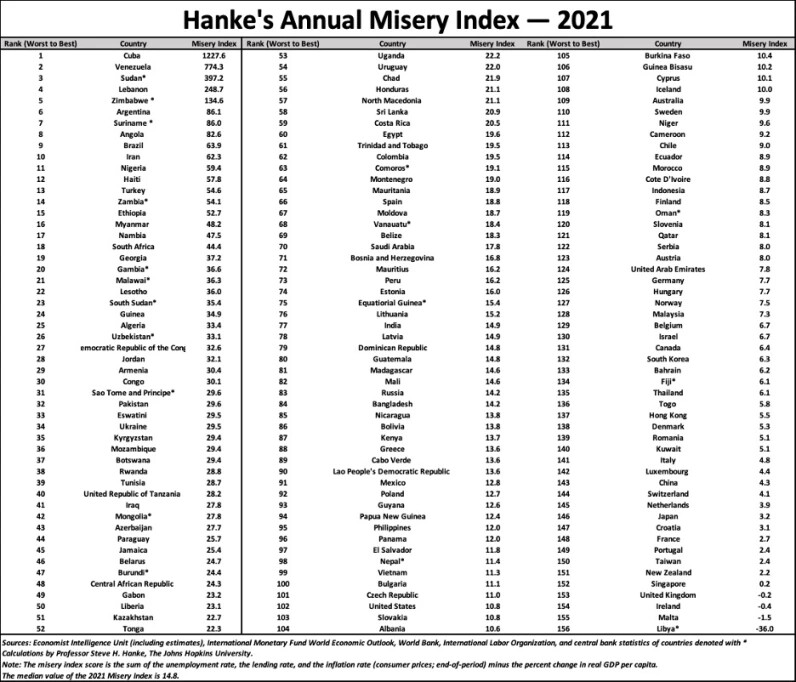 Hanke’s Annual Misery Index (2021) is out. Communist Cuba, ravaged by a SOARING 1,221.8%/yr inflation rate, is the most miserable place in the world. Socialist Venezuela is right behind — the second most miserable hole in the world. https://t.co/1DvJbiqvZc