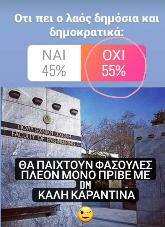 Χθες βράδυ το πάρτι υποδοχής πρωτοετών που διαφημίζονταν τελικά δεν έγινε. Η διάχυση των νεαρών έγινε στις πλατείες όπου η αστυνομία τη νύχτα κυκλοφορούσε και μετέδιδε μηνύματα για να διαλυθούν οι συγκεντρωμένοι.