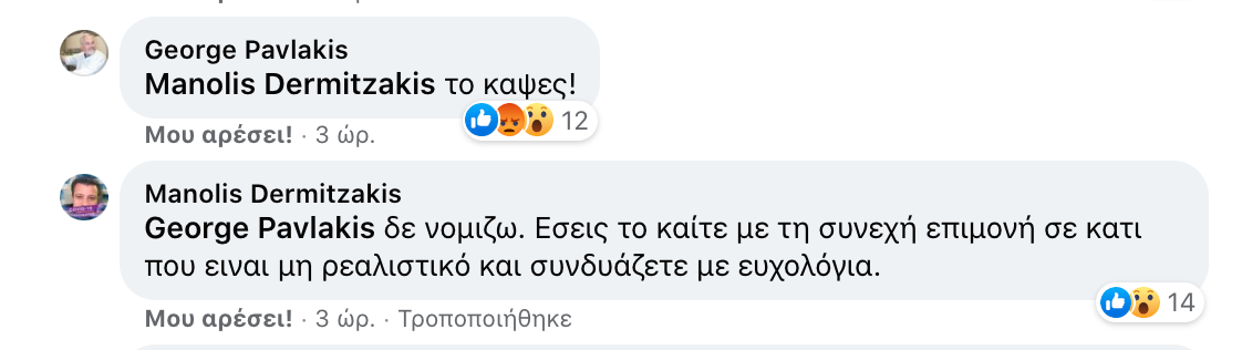 Η απάντηση του Γιώργου Παυλάκη στα σχόλια ήταν μόλις δυο λέξεις «το καψες». Για να του ανταπαντήσει ο Μανώλης Δερμιτζάκης: «Δε νομίζω. Εσείς το καίτε με τη συνεχή επιμονή σε κάτι που είναι μη ρεαλιστικό και συνδυάζετε με ευχολόγια».