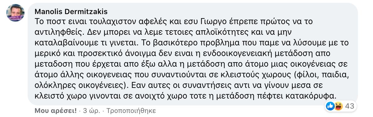 «Το ποστ είναι τουλάχιστον αφελές και εσύ Γιώργο έπρεπε πρώτος να το αντιληφθείς. Δεν μπορεί να λέμε τέτοιες απλοϊκότητες και να μην καταλαβαίνουμε τι γίνεται. Το βασικότερο πρόβλημα που πάμε να λύσουμε με το μερικό και προσεκτικό άνοιγμα δεν είναι η ενδοοικογενειακή μετάδοση από μετάδοση που έρχεται από έξω αλλά η μετάδοση από άτομο μιας οικογένειας σε άτομο άλλης οικογενείας που συναντιούνται σε κλειστούς χώρους (φίλοι, παιδιά, ολόκληρες οικογένειες). Εάν αυτές οι συναντήσεις αντί να γίνουν μέσα σε κλειστό χώρο γίνονται σε ανοιχτό χώρο τότε η μετάδοση πέφτει κατακόρυφα…