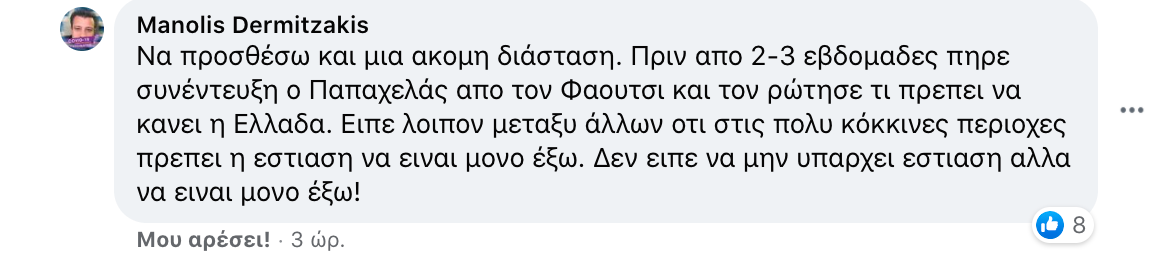 Να προσθέσω και μια ακόμη διάσταση. Πριν από 2-3 εβδομάδες πήρε συνέντευξη ο Παπαχελάς από τον Φάουτσι και τον ρώτησε τι πρέπει να κάνει η Ελλάδα. Είπε λοιπόν μεταξύ άλλων ότι στις πολύ κόκκινες περιοχές πρέπει η εστίαση να είναι μόνο έξω. Δεν είπε να μην υπάρχει εστίαση αλλά να είναι μόνο έξω!»