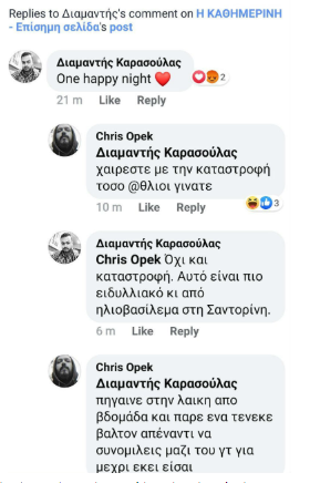 Μάλιστα, σε απάντηση χρήστη του Facebook «χαίρεστε με την καταστροφή, τόσο άθλιοι γίνατε», ο Διαμαντής Καρασούλας έγραψε: «Όχι και καταστροφή. Αυτό είναι πιο ειδυλλιακό κι από ηλιοβασίλεμα στη Σαντορίνη!»
