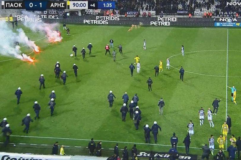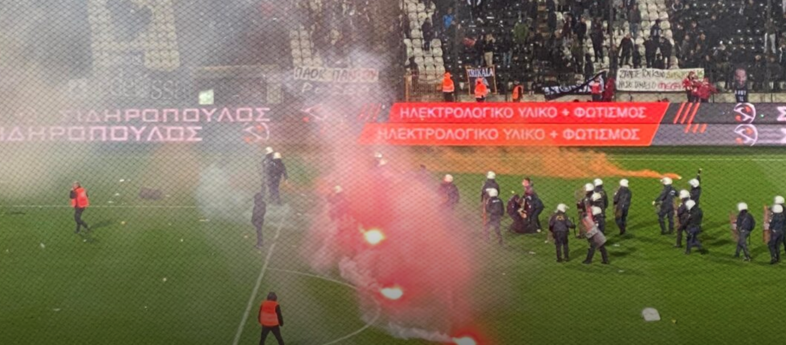 Τέσσερα λεπτά πριν το φινάλε και με τον Άρη μπροστά στο σκορ 0-1 οπαδοί του ΠΑΟΚ εισέβαλαν στον αγωνιστικό χώρο της Τούμπας πετώντας πλαστικά καθίσματα, αντικείμενα και πυρσούς.