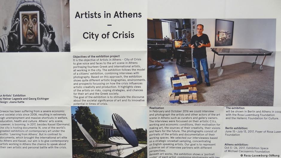 Σε αντίθεση με την documenta που φέρνει φέτος τις ελίτ του χώρου της τέχνης στην Αθήνα και το Κάσελ, μια άλλη έκθεση που εγκαινιάστηκε την Πέμπτη το βράδυ στο Βερολίνο δίνει την ευκαιρία σε 14 Έλληνες καλλιτέχνες να μιλήσουν για την δική τους καλλιτεχνική και προσωπική μάχη με την κρίση. Πρόκειται για καλλιτέχνες μεταξύ 24 και 72 ετών από την Αθήνα οι οποίοι ασχολούνται με παραστατική και αφηρημένη ζωγραφική, street art, γλυπτική, εγκαταστάσεις και φωτογραφία. Την πρωτοβουλία για την έκθεση είχε το πολιτικό Ίδρυμα Ρόζα Λούξεμπουργκ που πρόσκειται στο κόμμα Η Αριστερά (Die Linke). Στην έκθεση εκτίθενται από τον κάθε καλλιτέχνη φωτογραφίες τριών έργων του, όπως επίσης και πίνακες με χαρακτηριστικές τους δηλώσεις για τον τρόπο με τον οποίο επηρεάζει τους ίδιους και το έργο τους η κρίση.