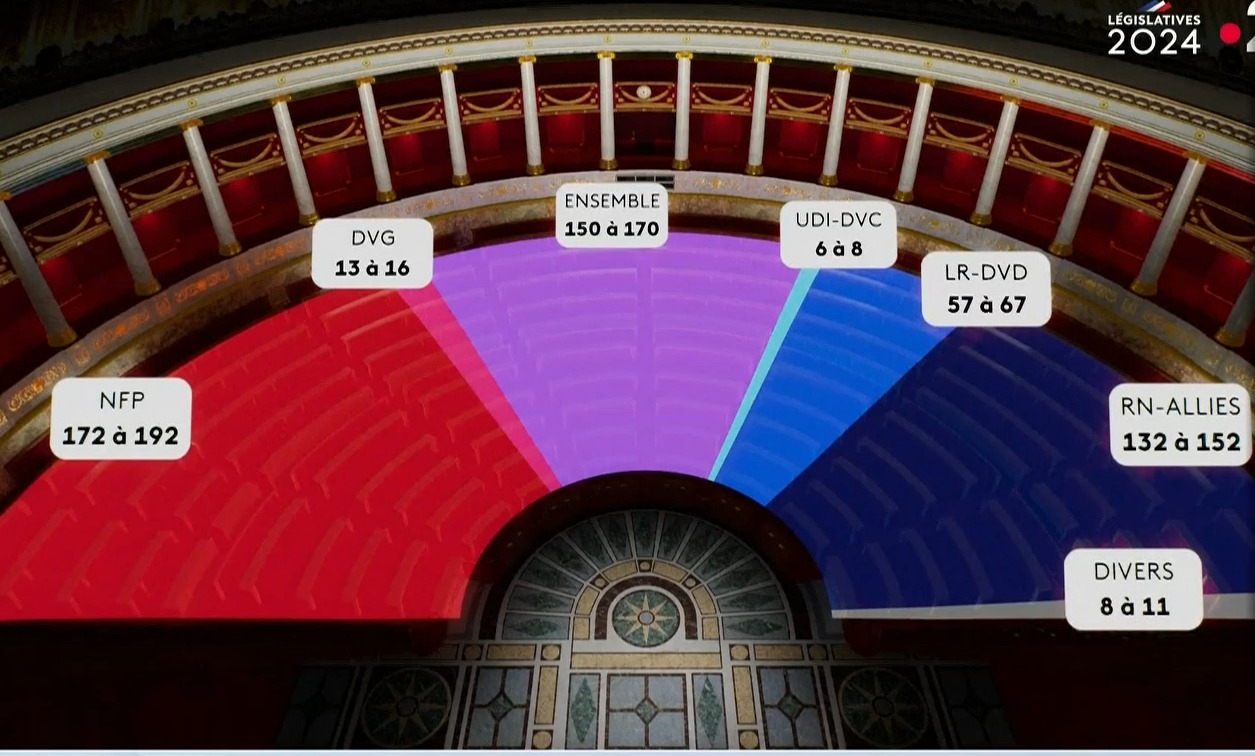 Η εικόνα που μετέδωσε το γαλλικό κανάλι France 24 για την κατανομή των εδρών, με βάση το exit poll: