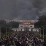 Οι διαδηλωτές τύλιξαν στις φλόγες το κτίριο του Κοινοβουλίου στην πρωτεύουσα, γεμίζοντας τον ουρανό με πυκνό μαύρο καπνό.