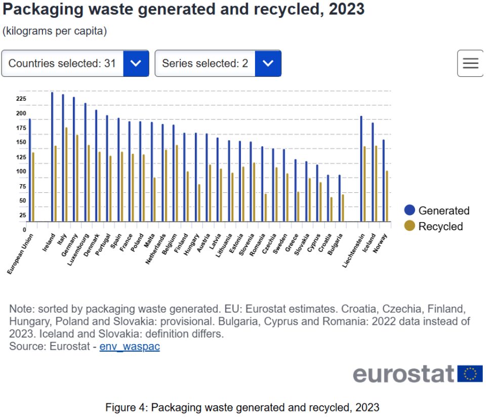 Νέα στοιχεία της Eurostat δείχνουν ότι η ΕΕ παρήγαγε σχεδόν 80 εκατομμύρια τόνους αποβλήτων συσκευασίας το 2023, που αντιστοιχούν σε 177,8 κιλά ανά κάτοικο.