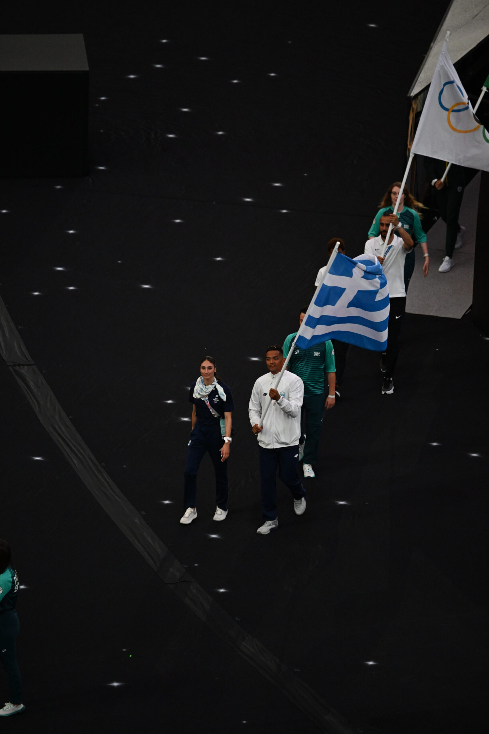 Ο Εθνικός Ύμνος της Ελλάδας ακούστηκε στο Stade de France, στο οποίο είχαν σβήσει τα φώτα, ενώ ανυψώθηκε και η ελληνική σημαία.