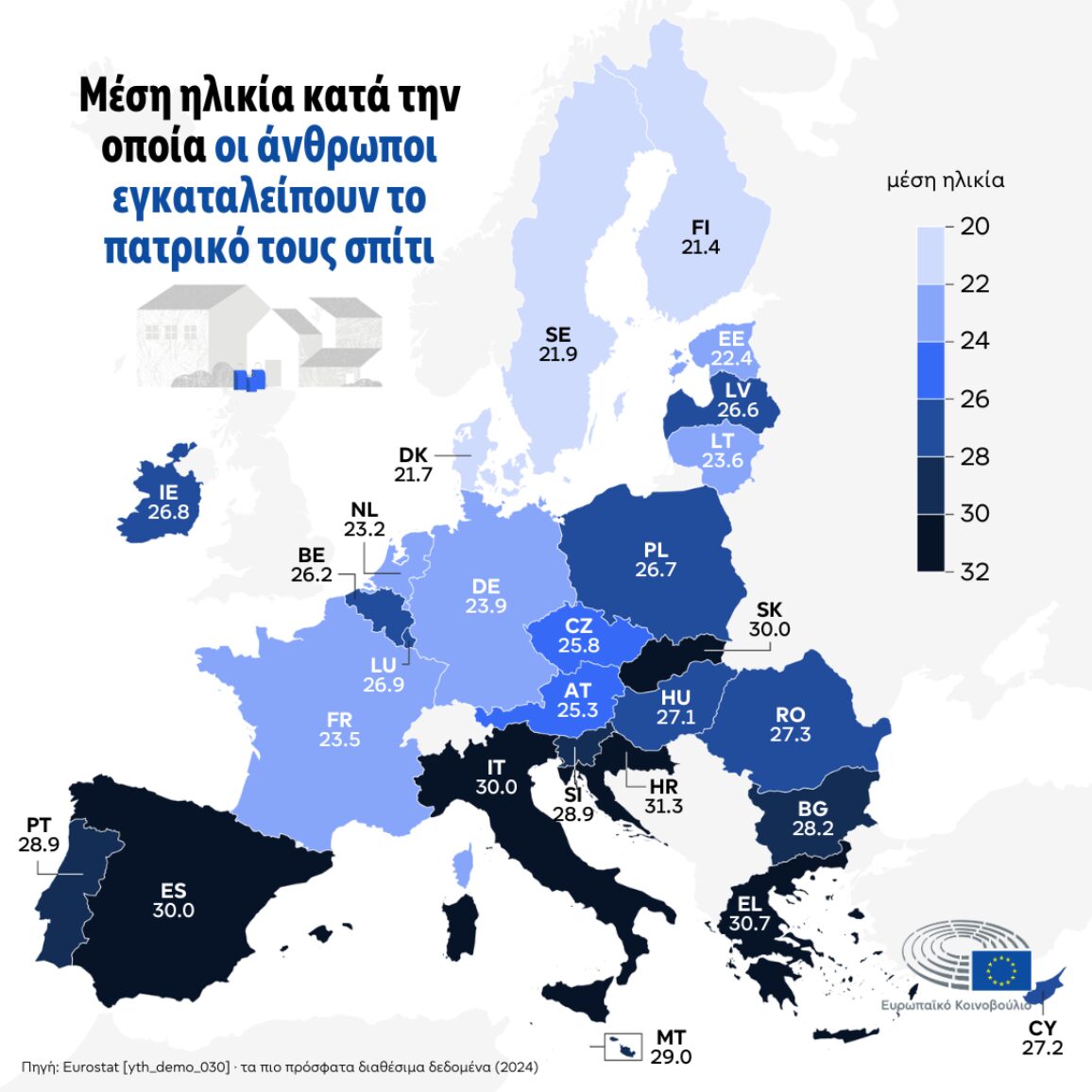 Στην ΕΕ, ο μέσος όρος ηλικίας εγκατάλειψης του γονικού νοικοκυριού ήταν 26,2 έτη το 2024. Αυτό ποικίλλει σημαντικά μεταξύ των χωρών της ΕΕ: από 21,4 έτη στη Φινλανδία έως 31,3 έτη στην Κροατία.