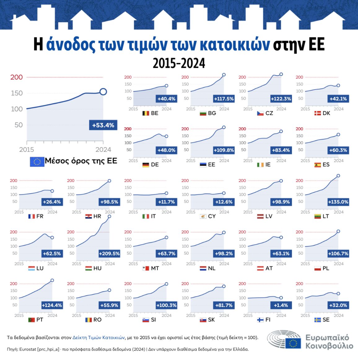 Μεταξύ 2015 και 2024, οι τιμές των κατοικιών στην ΕΕ αυξήθηκαν κατά μέσο όρο κατά 53%. Οι μεγαλύτερες αυξήσεις παρατηρήθηκαν στην Ουγγαρία (+209,5%), τη Λιθουανία (+135%) και την Πορτογαλία (+124,4%).