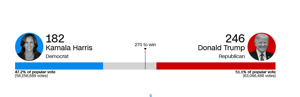 Σύμφωνα με την τελευταία ενημέρωση του CNN ο Ντόναλντ Τραμπ συγκεντρώνει 266 εκλέκτορες, τέσσερις πριν το όριο της εκλογής, έναντι 187 της Χάρις.