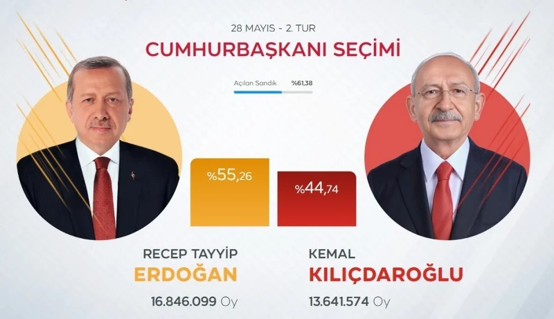 Με ταχύτατους ρυθμούς συνεχίζεται η καταμέτρηση των ψήφων. Με 52,18% προηγείται ο Ερντογάν και με 47,82% ο Κιλιτσντάρογλου στο 97,41% της ενσωμάτωσης.