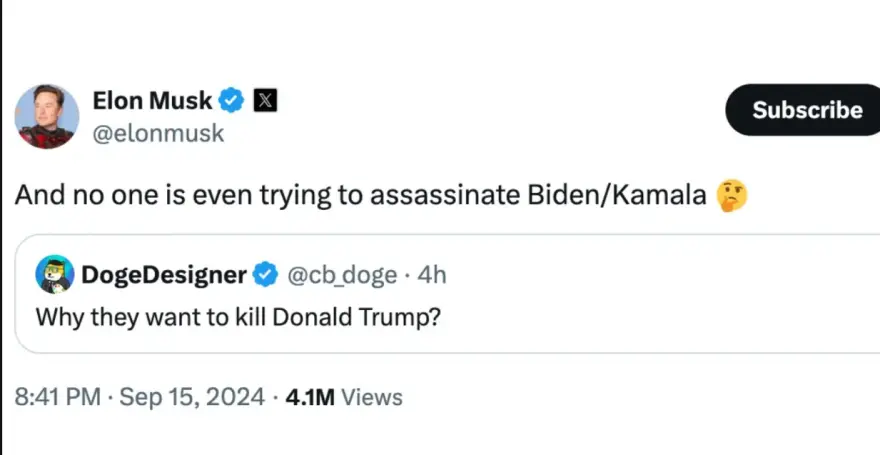 Απαντώντας στο ερώτημα που έθεσε ένας χρήστης του «X» για τα κίνητρα των επίδοξων δολοφόνων του πρώην προέδρου των ΗΠΑ, ο μεγιστάνας της τεχνολογίας έγραψε «Και κανείς δεν προσπαθεί καν να σκοτώσει τον Μπάιντεν ή την Κάμαλα», συνοδεύοντας το σχόλιό του με το emoji μιας σκεπτικής φατσούλας.