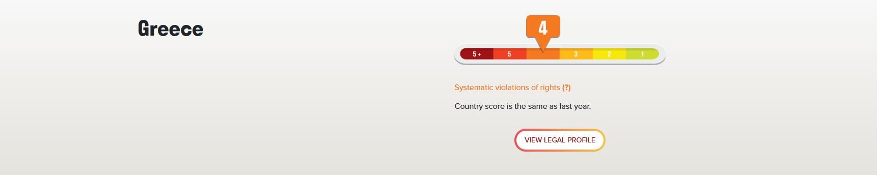 Η Ελλάδα παραμένει και φέτος στην 4η και προτελευταία κατηγορία, των χωρών με συστηματικές παραβιάσεις των εργασιακών δικαιωμάτων. Η ITUC μας βαθμολογεί με «πορτοκαλί» κάρτα, ένα σκαλί πάνω από τις χώρες εργασιακά κολαστήρια που κυβερνούνται από χούντες, πολύ χειρότερα από τον μέσο όρο των Ευρωπαϊκών χωρών (2,78)