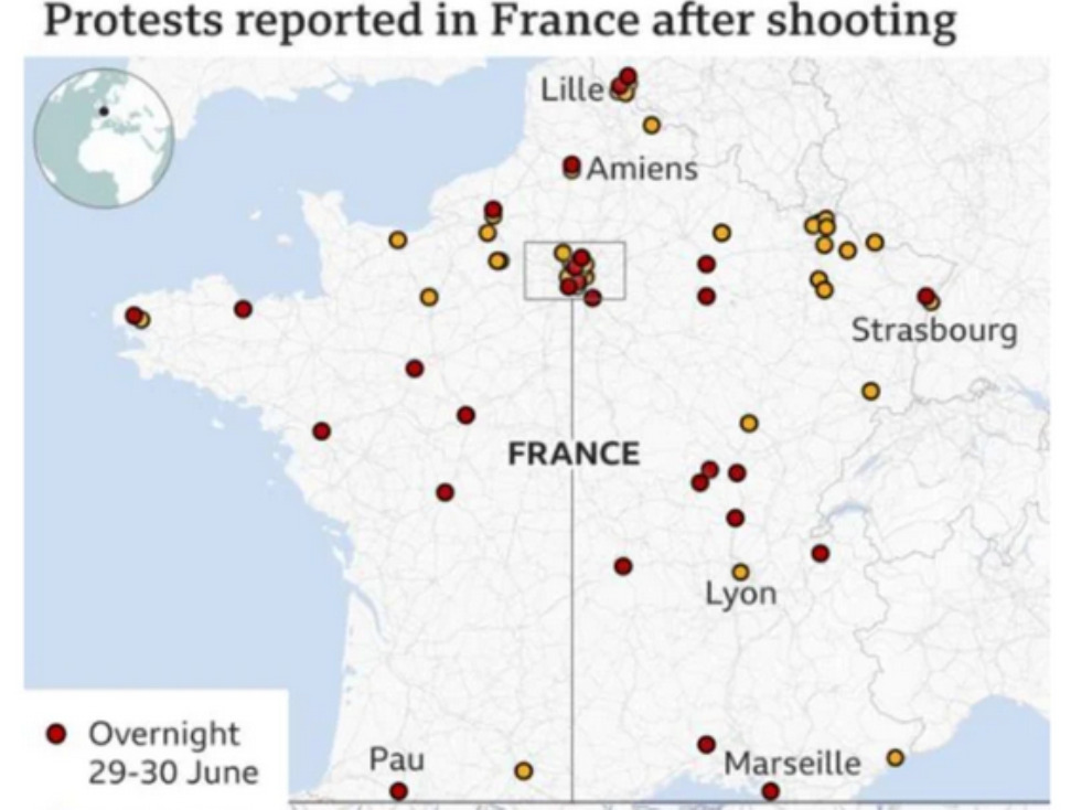 Police are unable to control the migrant and left-wing riots taking place across the country. French media has surrendered and cannot keep track of the number of towns and cities across the country being looted, set on fire, and destroyed. #FranceRiots pic.twitter.com/ttxrBg7eLh