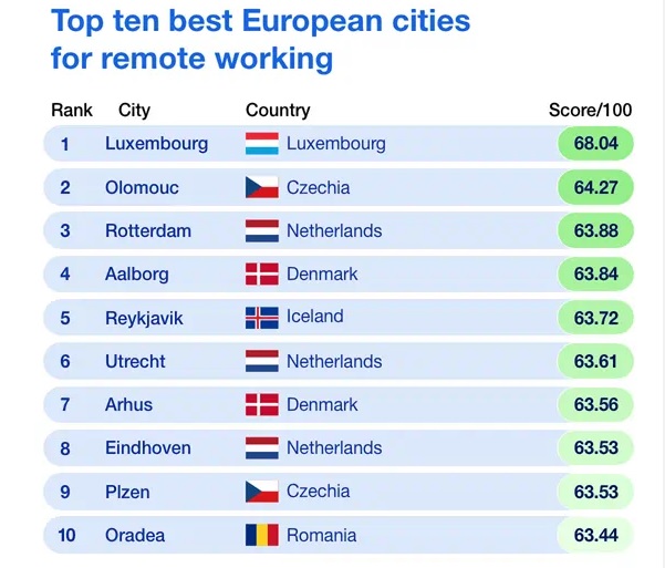 Η Brother UK, η εταιρία που εμπορεύεται ηλεκτρικό εξοπλισμό, δημοσίευσε τα αποτελέσματα της έρευνάς της αναφορικά με τις καλύτερες και τις χειρότερες τοποθεσίες στην Ευρώπη για εξ αποστάσεως εργασία. Ανέλυσαν παράγοντες όπως η ταχύτητα του Wi-Fi, το κόστος ενός διαμερίσματος, το κόστος ηλεκτρικής ενέργειας, η ασφάλεια εντός της χώρας και το γενικό κόστος ζωής. Στη συνέχεια, χρησιμοποίησαν μελέτησαν όλα αυτά τα στοιχεία για να προσδιορίσουν τη συνολική βαθμολογία ανά πόλη, με άριστα το 100.