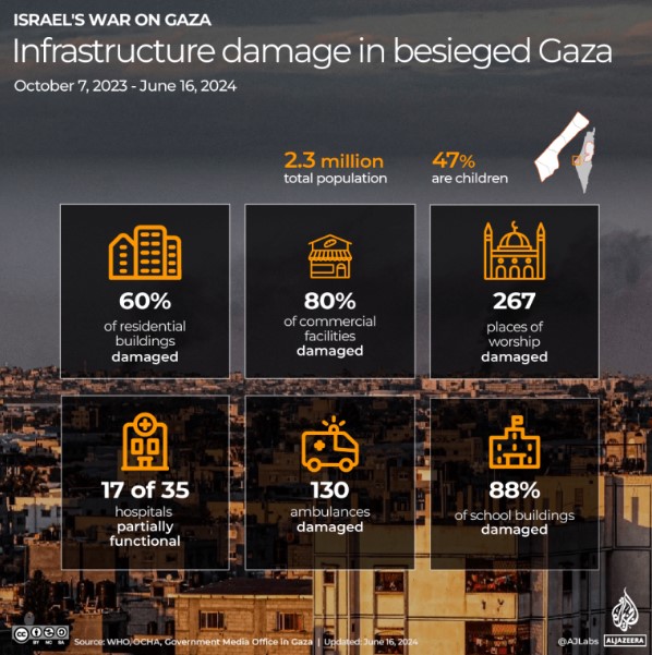 Το Ισραήλ έχει καταστρέψει περισσότερα από τα μισά κτίρια στη Γάζα κατά τους ανηλεείς βομβαρδισμούς του εναντίον όλων των δομών, ανέφερε η υπηρεσία του ΟΗΕ για τους Παλαιστίνιους πρόσφυγες (UNRWA) στις 10 Ιουνίου.