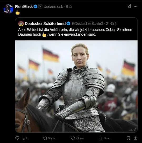 Νωρίτερα την Παρασκευή (21/02), ο Έλον Μασκ αναδημοσίευσε στον λογαριασμό του στο “Χ”, μία ανάρτηση που δείχνει φωτογραφία της προέδρου του AfD, Αλίς Βάιντελ, να είναι μεταμφιεσμένη ως Ζαν ντ’ Αρκ.