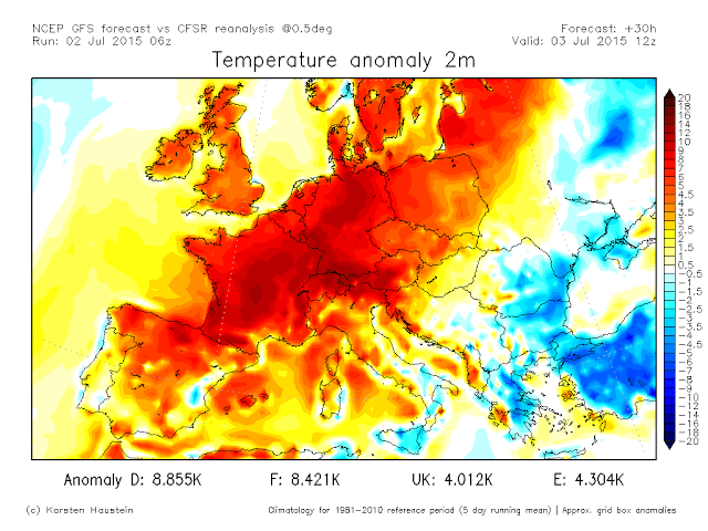 Τον Ιούνιο, οι μέσες μηνιαίες θερμοκρασίες ήταν περίπου τρεις βαθμοί πάνω από τις φυσιολογικές γι’ αυτόν τον μήνα σε διάφορες χώρες της δυτικής Ευρώπης (με βάση την περίοδο αναφοράς 1981-2010).