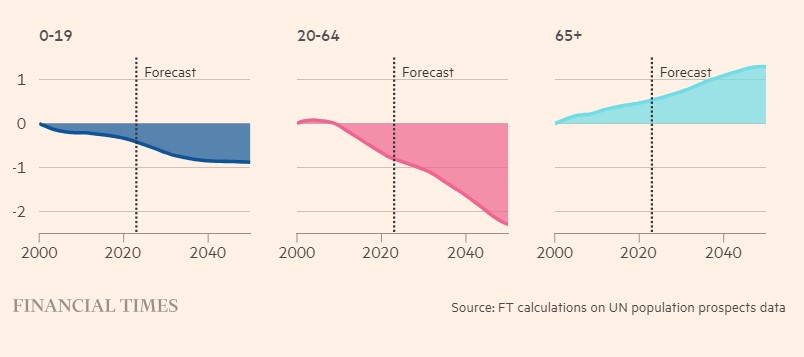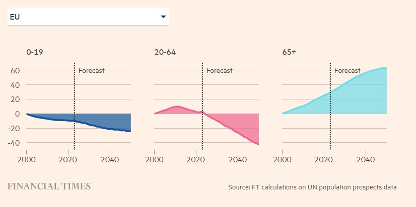 Πολλές από τις 27 χώρες που αποτελούν την ΕΕ έχουν βιώσει εξαιρετικά χαμηλά ποσοστά γεννήσεων εδώ και δεκαετίες. Με το πιο παραγωγικό τμήμα του πληθυσμού να συρρικνώνεται τώρα, υπάρχει πρόσθετη πίεση στα δημόσια οικονομικά με συνέπειες για τις οικονομικές προοπτικές και τη γεωπολιτική θέση του μπλοκ.