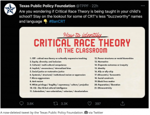 Η αντίθεση στην CRT μπορεί να μην είναι ακριβώς μια θεωρία συνωμοσίας, αλλά πολλοί από τους φόβους σχετικά με αυτήν προέρχονται από παραπληροφόρηση. Οι καθηγητές του Πανεπιστημίου της Βόρειας Καρολίνας, Alice Marwick και Daniel Kreiss, περιέγραψαν την εκστρατεία εναντίον της CRT ως «έναν ολοκληρωτικό πόλεμο παραπληροφόρησης» που επικαλείται ισχυρισμούς «οικοδομώντας επί μακρόν αντισημιτικές θεωρίες συνωμοσίας για τον μαρξισμό και τη Σχολή της Φρανκφούρτης».
