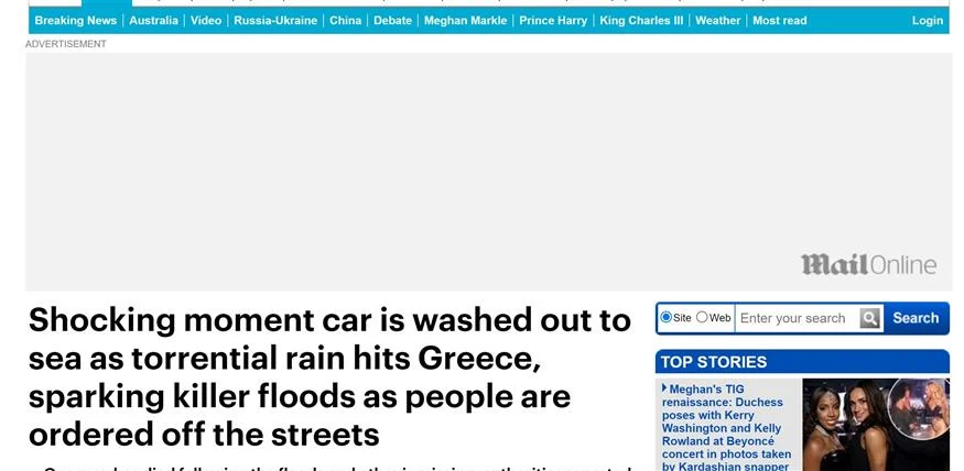 Η Daily Mail κάνει λόγο για τη «συγκλονιστική στιγμή που αυτοκίνητο ξεβράστηκε στη θάλασσα καθώς καταρρακτώδης βροχή πλήττει την Ελλάδα, προκαλώντας φονικές πλημμύρες, ενώ έχει επιβληθεί απαγόρευση κυκλοφορίας».