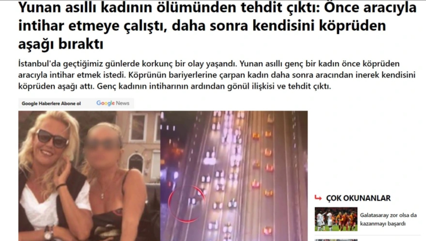 Σύμφωνα με πληροφορίες τουρκικών δημοσιευμάτων, η γυναίκα είχε προσχεδιάσει την αυτοκτονία της, καθώς νωρίτερα είχε επισκεφτεί φιλικό της πρόσωπο στο οποίο άφησε τα σκυλιά της να τα προσέχει. Το άψυχο σώμα της παρασύρθηκε από τα νερά του Βοσπόρου για να εντοπιστεί στη περιοχή Μπεσίκτας. Σύμφωνα, πάντα, με τουρκικά δημοσιεύματα, η αιτία που την οδήγησε στο απονενοημένο διάβημα ήταν η ερωτική απογοήτευση.