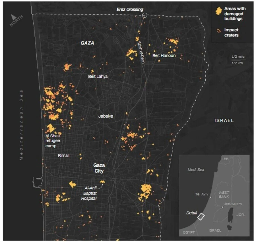 Ένα σημαντικό μέρος των ζημιών που μπόρεσε να επιβεβαιώσει το μέσο είναι στη βόρεια Γάζα. Μεγάλα τμήματα κτιρίων γύρω από την πόλη της Γάζας, την Μπέιτ Λάχαγια και την Μπέιτ Χανούν έχουν καταστραφεί. Εκατοντάδες κρατήρες σε όλη τη βόρεια Γάζα έχουν επίσης εντοπιστεί και καταγραφεί.