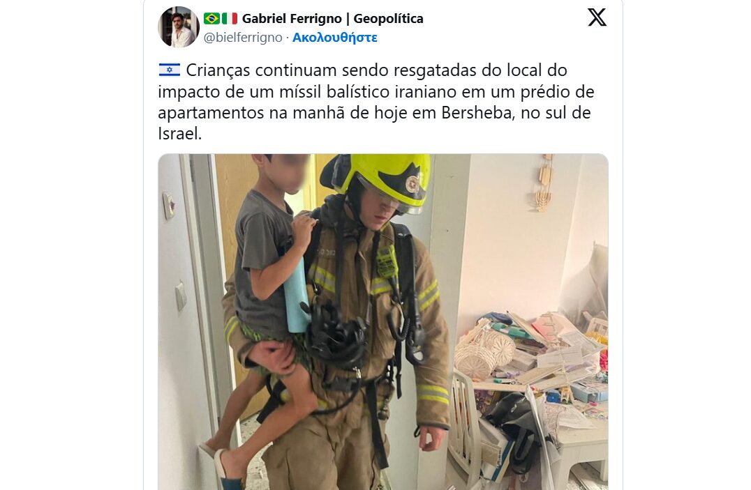 Mάχη με το χρόνο δίνουν τα σωστικά συνεργεία στην Μπερ Σεβά του Ισραήλ μετά την επίθεση με βαλλιστικό πύραυλο από το Ιράν που σημειώθηκε νωρίς το πρωί σε κατοικημένη περιοχή. Σε στιγμιότυπο που αναρτήθηκε στα μέσα κοινωνικής δικτύωσης φαίνεται ένας πυροσβέστης να έχει πάρει στην αγκαλιά του ένα αγόρι και να το διασώζει από το διαμέρισμά του που υπέστη σοβαρές ζημιές. Είναι άγνωστη η τύχη των υπόλοιπων μελών της οικογένειάς του.