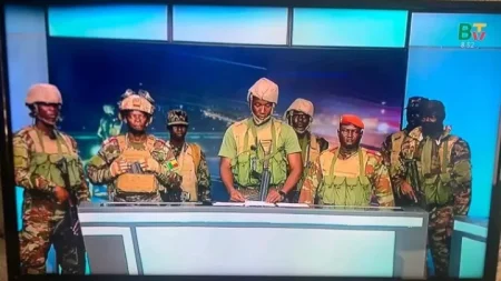Troops on live TV claim to have OVERTHROWN President Patrice Talon.