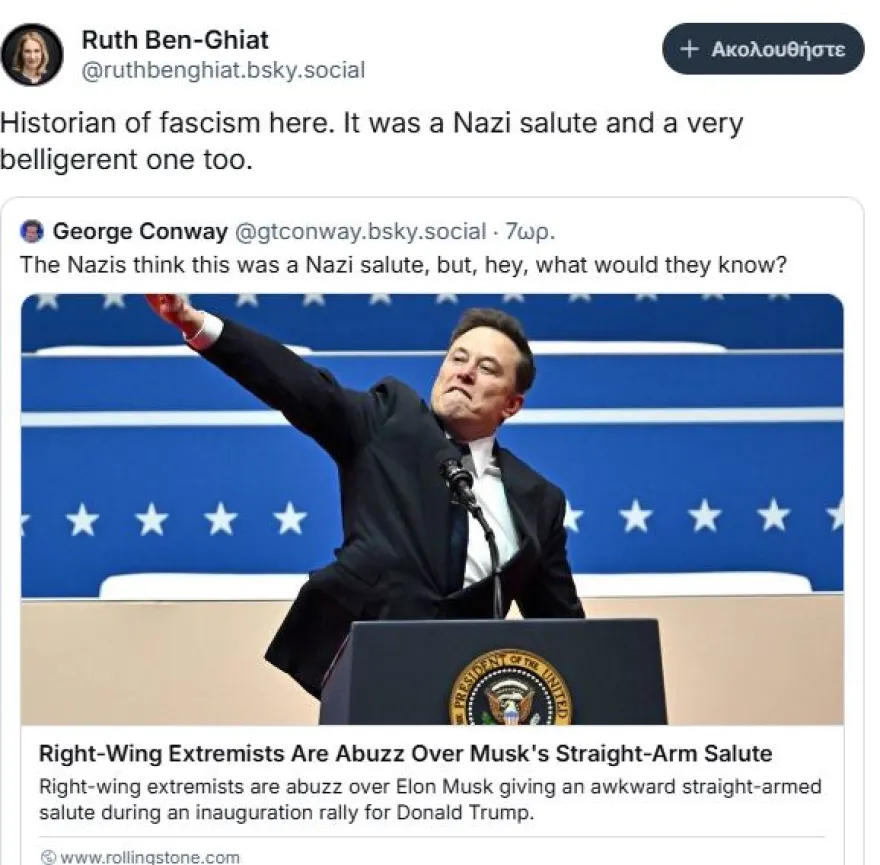 «Όταν κάποιοι αναρωτιούνται αν ο χαιρετισμός του πλουσιότερου ανθρώπου του πλανήτη κατά τη διάρκεια της ορκωμοσίας του ακροδεξιού προέδρου των ΗΠΑ ήταν ναζιστικος, “ρωμαϊκός”, ή απλώς αμήχανος (sic), τότε ίσως να είναι ήδη αρκετά αργά.